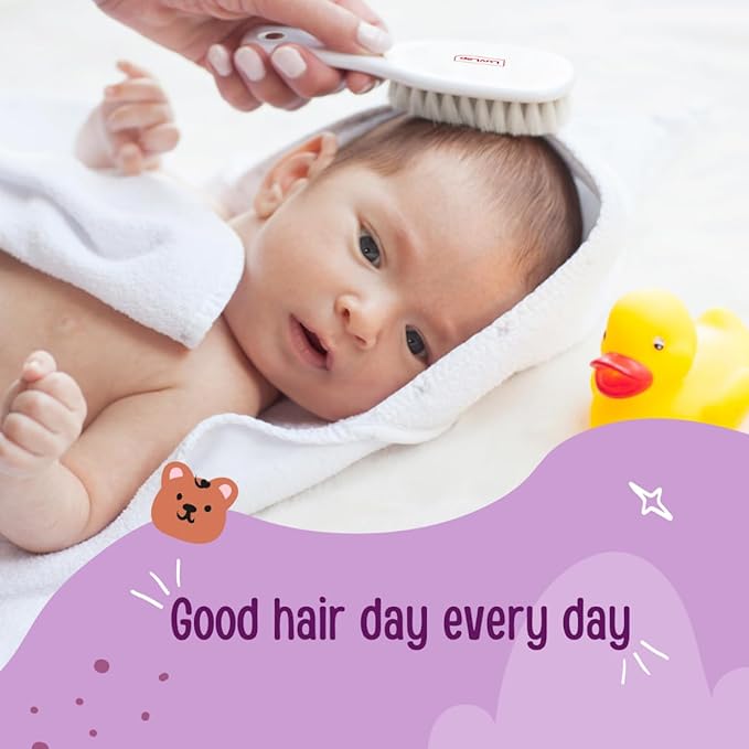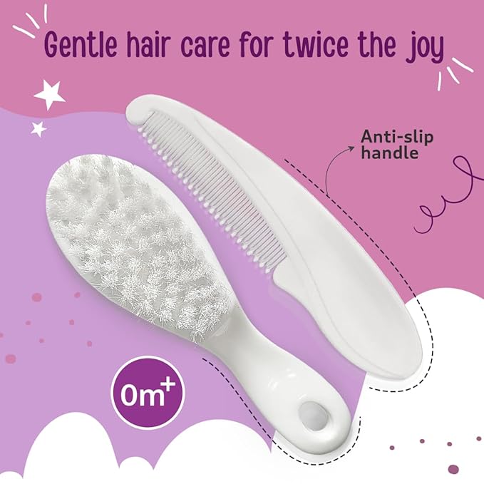 The rounded-edge comb teeth ensure gentle detangling while preventing scratches on sensitive skin. Both the comb and brush come with anti-slip handles, offering parents a firm and comfortable grip during use. Made from non-toxic, BPA-free materials, this baby grooming set is completely safe for everyday hair care from birth (0M+).
