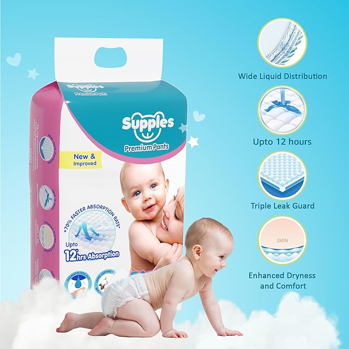 Supples Premium baby diapers are designed to keep your little one dry, comfortable, and protected day and night. Made with cushiony cotton soft fabric, these diaper pants feel gentle on delicate skin while providing breathable comfort. The advanced Zig-Zag channel top layer with ADL technology ensures even liquid distribution, keeping baby diapers dry and irritation-free.