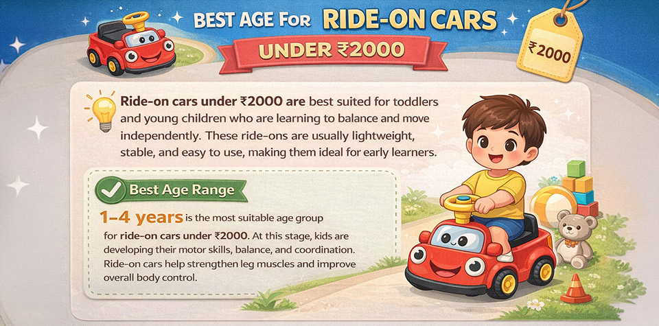 Ride-on cars under ₹2000 are best suited for toddlers and young children who are learning to balance and move independently. These ride-ons are usually lightweight, stable, and easy to use, making them ideal for early learners.